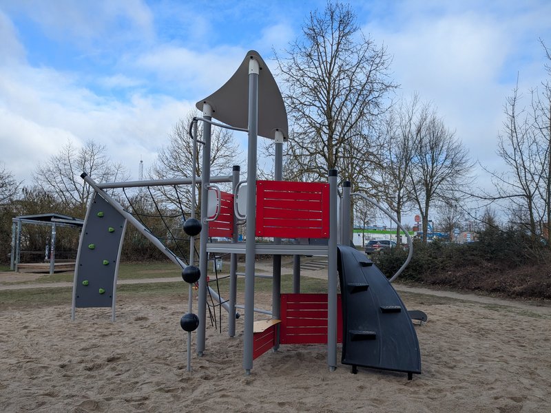 Ausstattung: drehbare Seilpyramide, Sandspielturm mit Rutsche für kleinere Kinder bis 6 Jahre, Spielgerät mit Rutsche für Kinder von 6 bis etwa 12 Jahre, Wipptier, Jugendhütte, Jugendtreff, 2 Kleinfeldtore, 1 Basketballkorb