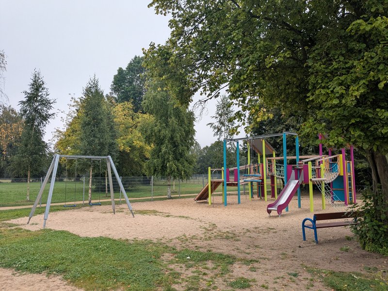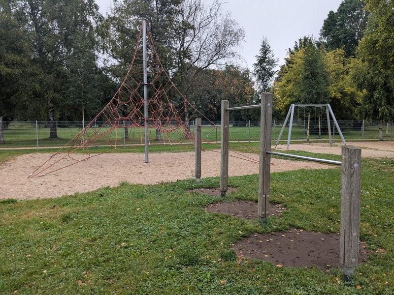 Ausstattung: Klettergerät mit Rutsche und Schwebebahn, Doppelschaukel, Seilkletterpyramide, Stufenreck, Tischtennisplatte, Bolzplatz mit 2 Fußballtoren
